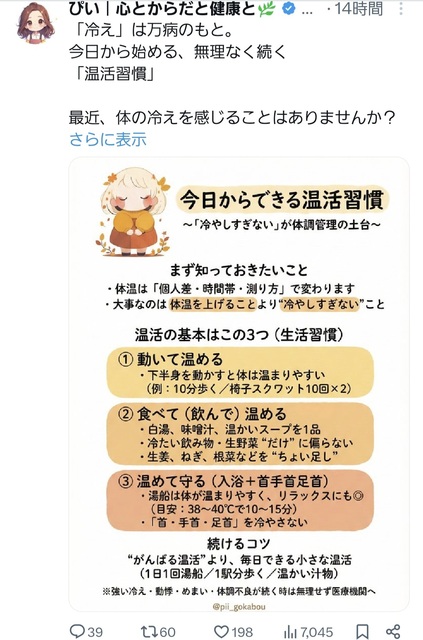 Dec 29 温活習慣♪(´ε`*)(音源あり) 2025/12/29 07:53 https://img.dto.jp/diary/756/328/1b5521397b7c5bcf4224347fbde27ff9.jpg" preload="none" controls data-width="462" data-height="822">ゆみです おはようございます(*´ω`) こんな記事を見つけました 冷えは万病のもとですね(*σ´ェ`)σ スクワットがんばりたいです 今日も素敵な1日を